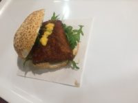 Tijgerbol met gebakken scholfilet, rucola, ravigottesaus en een rood uitje