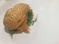Tijgerbol met gerookte zalm, pesto, rucola, pijnboompitjes, bieslook, oude kaas en een rood uitje