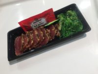 Rauwe tonijn in kruiden korst licht aangebakken en getrancheerd, samen met Japanse Wakame salade en kikkoman sojasaus en wasabi.