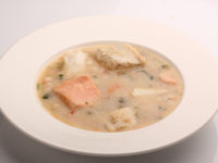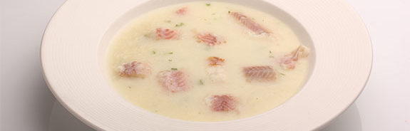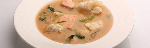 Heerlijke milde vissoep die ook zeer geschikt is voor kinderen. De bouillon wordt afgekookt met room en gevuld met kabeljauw, zalm, tonijn en zeewolffilet en daarna opgefrist met verse soepgroente. Een traktatie...