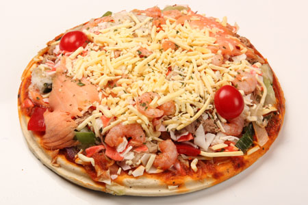 Krokante bodem belegd met fijne zeevruchten en verse groenten in heerlijke balsamico...
