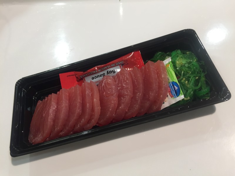 Sashimi van tonijn met wakamesalade, wasabi en Kikkoman soyasaus.